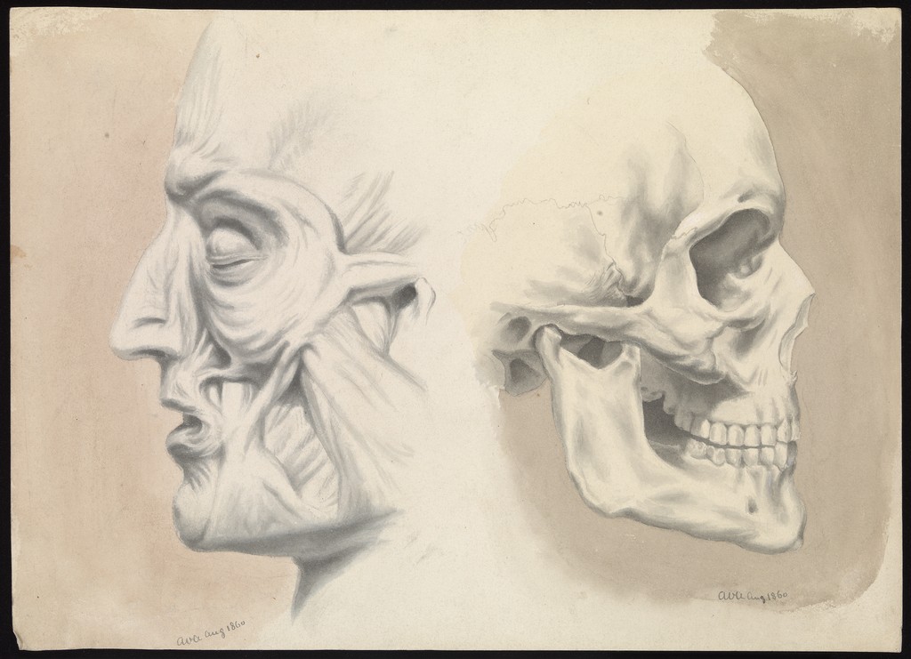Credit: Two figures of the human head in profile: (left) écorché, (right) skull. Ink and sepia wash painting by A.V.A., 1860. Source: Wellcome Collection.