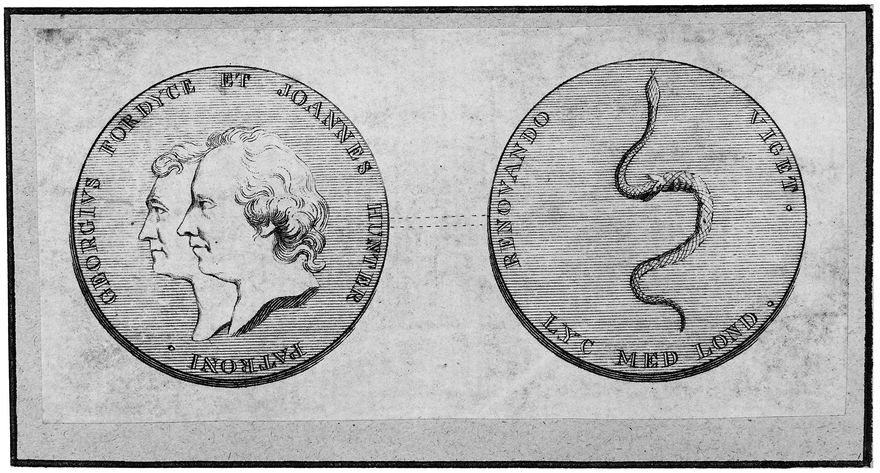Credit: M0016508: Illustration of both sides of a medallion showing the heads of George Fordyce and John Hunter. Source: Wellcome Collection.
