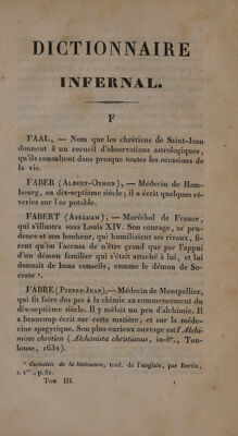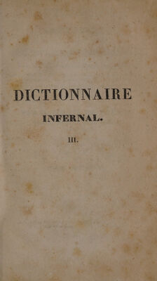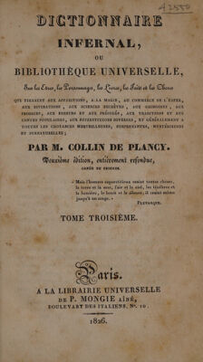 Dictionnaire infernal, ou bibliothèque universelle sur les êtres, les personnages, les livres, les faits, et les choses qui tiennent aux apparitions, à la magie, au commerce de l'enfer, aux divinations, aux sciences secrètes, aux grimoires, aux prodiges, aux erreurs et aux préjugés, aux traditions et aux contes populaires, aux supersititions diverses, et généralement à toutes les croyances merveilleuses, surprenantes, mystérieuses et surnaturelles / Par M. Collin de Plancy.