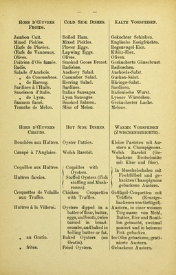 Dictionnaire universel pour la traduction des menus en français, allemand et anglais. 4. éd. corrigée : Allgemeines wörterbuch für übersetzung der speisekarten ... 4. verb. aufl. Universal dictionary of menus in English, French and German.