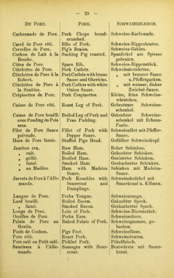 Dictionnaire universel pour la traduction des menus en français, allemand et anglais. 4. éd. corrigée : Allgemeines wörterbuch für übersetzung der speisekarten ... 4. verb. aufl. Universal dictionary of menus in English, French and German.
