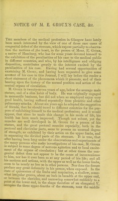 Notice of M.E. Groux's case of congenital fissure of the sternum, with observations of the position and actions of the heart / by Prof. Allen Thomson, M.D.