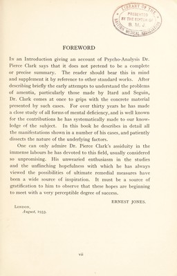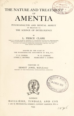 The nature and treatment of amentia : psychoanalysis and mental arrest in relation to the science of intelligence / by L. Pierce Clark ; assisted by the staff of the Psychoanalytic Sanatorium at Rye, N.Y., T. E. Uniker [and others] ; foreword by Ernest Jones.