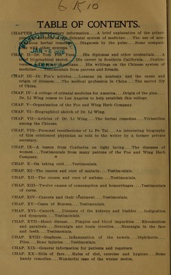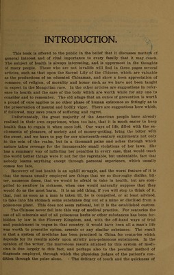 ![G- K'o TABLE OF CONTENTS. CHAPTER^U^Intrpd-HctQry information A brief explanation of the princi- plep^^Qreth<5cM^>}^vOriental system of medicine The use of non- Ksfcnous herbal remeo4fs\...Diagnosis by the pulse... .Some compari- Is with .other systems. C 3 with .other system; JAN - fi ]hZ6 II—Dr. Tom Fc& CH^P. II—Dr. Tom Foo Yuen/ ... His diplomas and other credentials.... A b\fif biographical sketch.y^His career in Southern California... .Contro- versr^i^fciijgf^bjg^p^ygtcians... .His writings on the Chinese system of medicine Testimonials from patrons and friends. CHAP. Ill—Dr. Foo's articles Lessons on anatomy and the cause and origin of diseases... .The medical profession in China.... The sacred lily of China. CHAP. IV—A college of oriental medicine for America... .Origin of the plan.... Dr. Li Wing comes to Los Angeles to help establish this college. CHAP. V—Organization of the Foo and Wing Herb Company. CHAP. VI—Biographical sketch of Dr. Li Wing. CHAP. VII—Articles of Dr. Li Wing The herbal remedies Vivisection among the Chinese. CHAP. VIII—Personal recollections of Li Po Tai....An interesting biography of this celebrated physician as told to< the writer by a former private secretary. CHAP. IX—A lesson from Confucius on tight lacing... .The diseases of women Testimonials from many patrons of the Foo and Wing Herb Company. * CHAP. X—On taking cold Testimonials. CHAP. XI—The causes and cure of malaria... .Testimonials. CHAP. XII—The causes and cure of asthma Testimonials. CHAP. XIII—Twelve causes of consumption and hemorrhages... .Testimonials of cures. CHAP. XIV—Cancers and their treatment... .Testimonials. CHAP. XV—Cases of Eczema Testimonials. CHAP. XVI—Catarrh... .Diseases of the kidneys and bladder... .Indigestion and dyspepsia Testimonials. CHAP. XVII—Heart disease Pimples and blood impurities. .. .Rheumatism and paralysis... .Neuralgia and brain troubles Neuralgia in the face and teeth.... Testimonials. CHAP. XVIII—Deafness Inflammation of the bowels Diphtheria Piles... .Bone injuries... .Testimonials. CHAP. XIX—General information for patients and inquirers. CHAP. XX—Bills of fare Rules of diet, exercise and hygiene Some handy remedies Wonderful case of the winter melon.](https://iiif.wellcomecollection.org/image/b21070398_0008.jp2/full/800%2C/0/default.jpg)