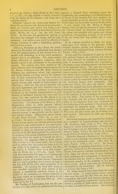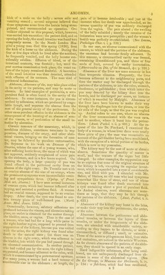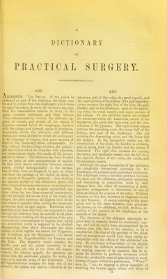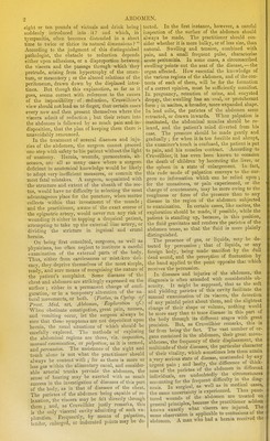 ![DICTIONAEY 03? PEACTIOAL SURGERY. ABD Abdomen. The Belly. if the pelvis be reckoned as part of the abdomen, the latter maj'- be said to extend from the diaphragm, which fomis its upper boundary, down to the levatores ani, and, from the transversales muscles in front, to the spine, quadrati lumborum, and iliaci behind. Thus comprehensively viewed, the abdomen ap- pears to contain and protect all tlie organs of digestion situated below the oesophagus, together with the urinary and interna] organs of generation. Anatomists divide the abdomen into different rpQions,t\ie terms allotted to which are so frequent in the language of surgery, that some account of them in this Dictionary seems indispensable. In fact, without the knowledge of them, the patholo- gist can neither direct his inquiries witli precision, nor communicate clearly the results of his investi- gations to others. The abdomen has been divided into as many as nine compartments or regions, by four lines drawn arbitrarily between certain points, readily distinguishable on the surface, two of these lines are imagined to pass on either side from the cartilage of the eighth rib down to the centre of Poupart's ligament,—thus dividing the anterior surface of the abdominal paries into three longitudinal compartments,a central and two lateral. Each of these is again subdivided into three others by two lines extended transversely, the one between the lowest level of the costal car- tilages, the other between the highest level of the iliac crests of opposite sides, cutting the former per- pendicular lines at right angles. Partitions corre- sponding with these four lines are supposed to pass through the abdomen from its anterior to its poste- rior boundary, marking out the positions of the nine conventional compartments or regions into which the abdominal cavity is supposed to be divided. Enumerating from above downwards the three central of these regions are named the Epigastric, the Umbilical, and the Hypogastric ; the lateral are termed the Hypochondriac, the Lumbar, and the Iliac. The epiyasiiic region contains the middle part and the pyloric extremity of the stomach, the left lobe of the liver, the hepatic vessels, the lobulus spigelii, the pancreas, the cadiac axis, the semilunar ganglia, the aorta, the vena cava, and the crura of the diaphragm. The left hi/poc/iondrium contains the large end of the stomach, the spleen and narrow extremity of the ABD pancreas, part of the colon, the renal capsule, and the upper portion of the kidney. The right hi/pochon- driiim contains the right lobe of the liver, the gall- bladder, part of the duodenum, some of the ascend- ing colon, the renal capsule, and upper portion of the kidney. In the umbilical region are situated the transverse colon, the transverse portion of the duodenum, the aorta, ,the vena cava, and the con- volutions of the jejunum. The riglit lumhar region contains the ascending colon, the lower half of the kidney, and part of the duodenum. The left contains the descending colon, and the lower half the kidney. In the hypogastric region are the convolutions of the ilium, the bladder in children, and, in adults, both the bladder and the uterus, if distended. The right iliac contains the coscum, the ureter, and spermatic vessels, and the left iliac, the sigmoid flexure of the colon, the ureter, and the spermatic vessels. Although the upper boundaries of the abdomen are completely determined internally by the diaphragm, they remain quite undefined externally. The diaphragm being a movable partition between the chest and the abdomen, alternately ascending and descending in respiration, must by such changes have the effect of occasioning a corre- spondent enlargement or diminution of one of these cavities at the expense of the other. Without attention to this fact, mistakes in diagnosis would be very frequent. A sword, entering at the same point, and in the same direction, may penetrate the thorax, or the abdomen, or both cavities, ac- cording to the position of the diaphragm at the moment of the injury. The functions of the abdomen essentially re- quire that its capacity should be continually vary- ing ; and had its cavity been circumscribed by an osseous case, like that of the cranium, or by a construction like that of the parietes of the chest, such an arrangement would have been totally in- compatible with the offices of the abdominal vis- cera. So convinced is Crnveilhier of the facility with which the abdomen accommodates itself to the varying quantity of its contents, that he re- gards the doctrine as perfectly erroneous wliich refers the irreducible state of some hernia; to insuf- ficiency of space within the peritoneum. What! says he, can we suppose a cavity incapable of receiving the bowels again, which will allow of B](https://iiif.wellcomecollection.org/image/b21461806_0001_0013.jp2/full/800%2C/0/default.jpg)