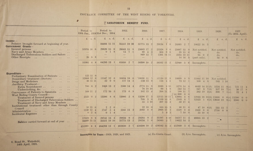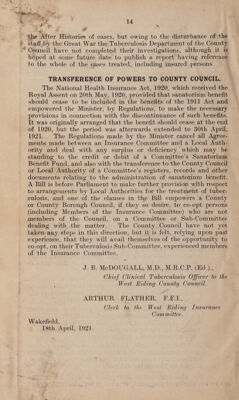Report by the Chief Tuberculosis Officer of the West Riding County Council and the Clerk to the West Riding Insurance Committee upon sanitorum benefits for the period from July, 1912 to April, 1921 / the Insurance Committee of the West Riding of Yorkshire.