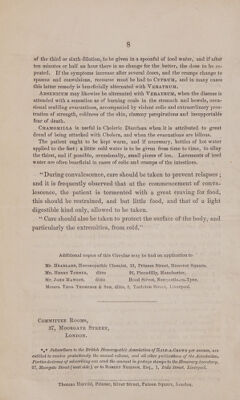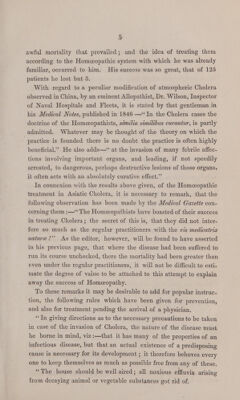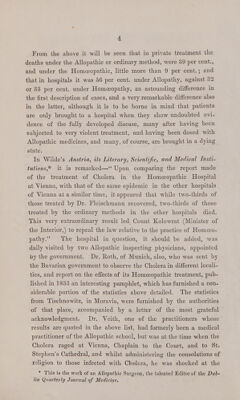 ![profession are “ entirely at a loss for any certain principle of treat- ment,” has, as far as relates to the majority of practitioners, been fully confirmed. The gloomy conclusion, however, to which we should thus be led is denied by those who recognize the Homeopathic system, and who are conversant with the comparative results between that and the ordinary method. These results, which were obtained from 1831 to 1834, in various parts of Europe, are as follows :— TREATED AT THEIR OWN HOUSES. Resulis of Allopathic or ordinary treatment Results of Homeopathic treatment of of Cholera. Cholera. Cases. Deaths. Cases. Deaths. ~ At Tischnowitz, in Moravia..... 331 .. 102 | By Dr. Baer, at Prague... ........ 80.. 0 », Wishney es in Dr; Bakody, at Raab i in Hungary 154... 6 TUSSI cncd cere ae eerec sete LOD +0, foo », Dr. Duplat, at Marseilles...... 60 .. 12 is Merseburg.. a wheat wows 264 65, L0E », Dr. Gerstel, at Tischnowitz, in », Raab, in flungary .. Eee te ne LONG ce OS INE OM aIVAlae ss Aas eos oar wee 327... 32 In yarious Cavalry Regiments in 3 DE Hanuseh, ‘at Tischnowitz.. Bilis 6 Great Britain vo... .e7.:. vo FO SE | 55 Dre Kleiner, at Saratof, in Russia 183 Bn 24ef », the Troops at Gibraltar...... 459 .. 181 », Dr. Jal, at Marseilles.......... VO... Ltt: », the Troops at Nova Scotia and », Dr. Lederer, at Vienna........ 80.. 2 New Brunswick ....... .. DD ey een] », Dr. Lens, at Pesth..... Bs spheite 40... 8 », une Trpops in Canada.......:— 856... 127 », Dr. Lichtenfels, at Vienna..... 44., 3 p20, Lowy atePraguesk. {i.e 80 .ad38 5, Dr. Marenzeller, at Vienna.... 30.. 38 »,5 Dr. Mayer, at Pesth.. : 65... 0 », Dr. Quin, at Tischnowitz & 1 aris48 ee) oS Peis Rummel, at seer Derg 46... 16 5) Dr. schaller, abPrarue.. i... 118... 0 wt DE. Schreter, at Lemoerg.. ae BE sok & », Dr. Schultz, at Vieima ..... Lice. 0 », Dr. Scider, at Wishney, W « tote schok, in Russia.....-. 109 .. 23 a Dye Vrecka, at Vienna d& Sclowitz 144 .. 12 49 Dre Veith, at Vienna . ose oi0is 280 ws 8 3107 ..1231 1876 .. 169 eee od . pees ee) pe ay About one death in every 23 cases, or more | About one death out of 11 cases, or little more than 39 per Cent. than 9 per Cent. [It is proper to mention, that these results must not be received without caution, on ac- count of the variations in the intensity of the disorder at different places and periods. Ina considerable degree, however, the Homeopathic statements are supported by testimonials and acknowledgments from local authorities. ] TREATED IN HOSPITAL. Cases. Deaths, | Cases. Deaths, In the Drummond Street Cholera By Dr. Fleischmann, at Vienna....732 ..244 Hospital, Edinburgh... 461 ..291 », Drs. Haynel and Se at 3, the Cholera Hospital, Berlin, Berlin oaAs-.6 ssa Sau-b0 sedate ewes O under Dr. Bohr .2. 7653... 97 .. 64 », Dr. Mabit, at Bordeaux . Oe eee ns: Krunkenburgs wards, at Halle. 104 .. 53 Hamburg h ated Oct. and Nov. 1831 .. 1.299: ge LTS In the Cholera Hospital, St. Petersburgh, by Dr. Lichten- 92 3) 39 stadt. 014 npc cee ooee 636 ..317 » the Hospital, Raab...........+..284 ..122 », the Hospital, Bordeaux . Sec 64 saeade 1969..1097 795 ..256 — eee About one death in 1 4-5th cases, or about | About one death in 3 1-10th cases, or between 56 per Cent. 4 32. and 33 per Cent.](https://iiif.wellcomecollection.org/image/b33098906_0007.jp2/full/800%2C/0/default.jpg)