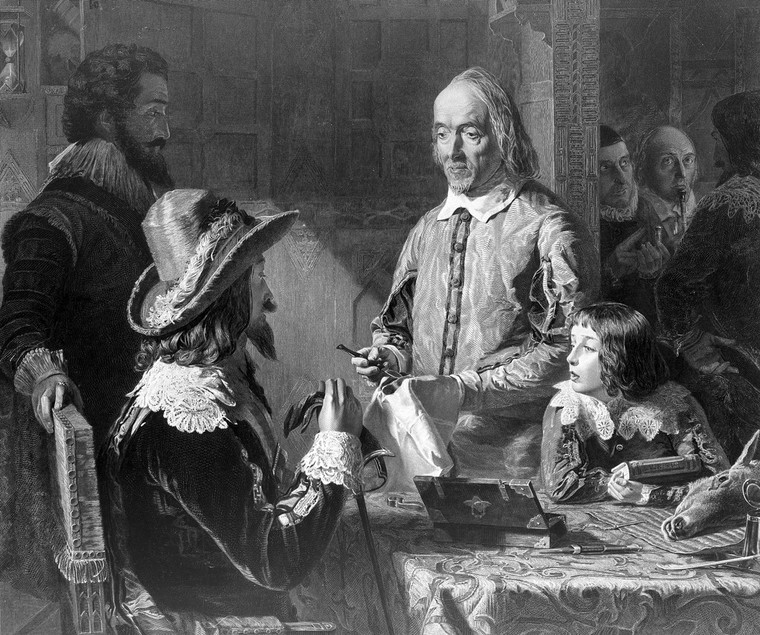 M0016121: William Harvey demonstrating the palpitations of the foetal heart of a deer to King Charles I. In copyright. Source: Wellcome Collection.