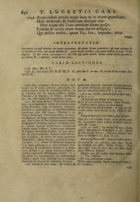 De rerum natura libri sex / Cum notis integris Dionysii Lambini, Oberti Gifanii, Tanaquilli Fabri, Thomae Creech, et selectis Jo. Baptistae pii, alliorumque, curante Sigeberto Havercampo, qui & suas & Abrahami Preigeri adnotationes adjecit. Acc. interpretatio Thomae Creech, variae lectiones et notulis Is. Vossii, etc.
