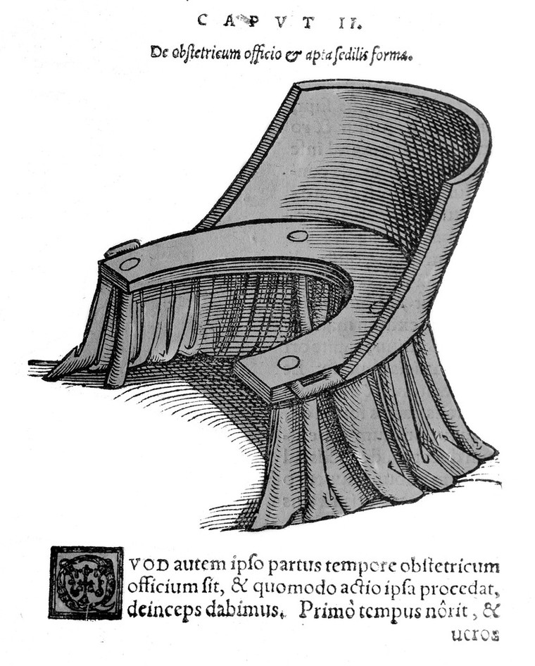 M0007458: Illustration of parturition chair designed by Rüff, 1554. In copyright. Source: Wellcome Collection.