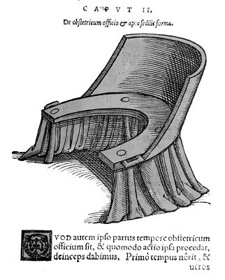 Credit: M0007458: Illustration of parturition chair designed by Rüff, 1554. Source: Wellcome Collection.