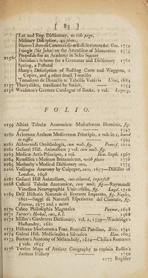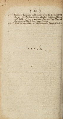 ![[ 81 ] 2177 Regifter of Premiums and Bounties given by tine Society of Arts, 17 7 8—An Analyfis of Mr. Locke’s Dodirine of Ideas, —A Table of Greek Verbs on Canvas—Two Maps of Germany and North America on Canvas 2178 Price’s Six Sonatas for two Violins—and a Parcel of Mu fick * I. / f F IN I S. \ )■ ;, .* a.](https://iiif.wellcomecollection.org/image/b30793695_0100.jp2/full/800%2C/0/default.jpg)