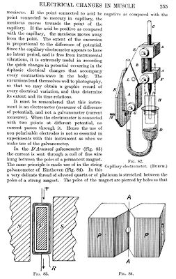 M0015495: Illustrations of electrometers for measuring and detecting small electric currents in electrophysiology: Lippmann's capillary electrometer, D'Arsonval's moving coil galvanometer and Einthoven's string galvanometer