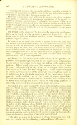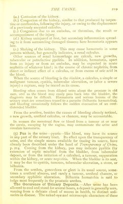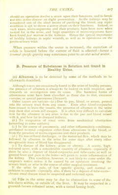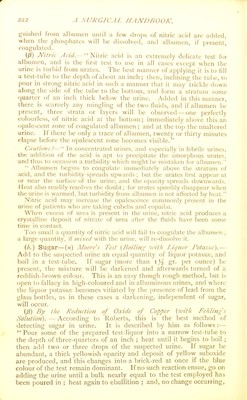![2.12 A Slfk'GJC.M. I/ANDHOUK. yiiished fi(jiii allnimcn unlil a few drfijis of nitric acid arc added, when the ])ii()s])iialcs will be dissolved, and alljunien, if jiresenli coaf»ulatcd. (^) Nilric Add.- Nitric acid is an extremely delicate test for albumen, and is the iirst test to use in all cases except when the urine Is turbid from urates. The best manner of applyinj^ it is to fill a tesl-tube to the depth of about an inch; then, inclining the tube, to pour in strong nilric acid in such a manner tliat it may trickle down along the side of the lui)e to the bottom, and form a stratum some <|uarter of an inch thick below the urine. Added in this manner, there is scarcely any mingling of the two fluids, and if albumen be present, three strata or layers will be ob.served —one jierfectly colourless, of nitric acid at the bottom; immediately above this an opalescent zone of coagulated albumen; and at the lop Ihe unaltered urine. If there be only a trace of albumen, twenty or thirty minutes elapse before the opalescent zone becomes visil)le. Ctiii/ion.s/- In concentrated urines, and especially in febrile urines, the addition o{ the acid is a]3t to precipitate the amorphous urates, and thus to occasion a turbidity which might 1)e mistaken for albumen. Albumen begins to coagulate immediately above the .stratum of acid, and the turbidity spreads upwards; but the urates first appc-ar at or near the surface of the urine, and tile opacity sjjreads downwards. Heat also readily resolves the douijt; for urates speedily disappear when llie m ine is warmed, l)ut turbidity fnjui albumen is not affecleil by heat. Nitric acid may increase the ojjalescence commonly present in the urine of jiatients who are taking cubeljs and copaiba. When excess of urea is present in the urine, nitric acid produces a crystalline deposit of nitrate of urea after tlie fluids have been some time in cf)ntact. 'loo small a (|iiantity of nitric acid will fail to coagulate the albumen ; a large tjuantity, if mixed with the urine, will re-dissolve it. (b.) Sugar—(a) .Moore'.': 'J'esl (Boiliili^ '.vith Liquor I'otaasi,-).— Add to the susjiected urine an equal quantity of liquor jiotassa.-, and boil in a test-tube. If sugar (more than 1^ gr. per ounce) be present, the mixture will be darkened and afterwards turned of a reddi.sh-brown colour. This is an easy though rough method, but is open to fallacy in high-coloured and in allnmiinous urines, and where tiie liciuor potassx becomes vitiated l)y the jiresence of lead from the glass bottles, as in these cases a darkening, independent of sugar, will occur. (/3) By llic Reduction of Oxide of Copper [with Fchliiig s Solution). — According to Roberts, this is the best method of detecting sugar in urine. It is described liy him as follows :— Pour some of the prepared test-liquor into a narrow test-tube to the depth of three-quarters of an inch ; heat until it begins to boil ; then add two or three drops of the .suspected urine. If sugar be abundant, a thick yellowish opacity and deposit of yellow suboxide are produced, and this changes into a brick-red at once if the blue colour of the test remain dominant. If no such reaction ensue, go on adding the urine until a bulk nearly equal to the test employed has been poured in ; heat again to ebullition ; and, no change occurring,](https://iiif.wellcomecollection.org/image/b21514124_0234.jp2/full/800%2C/0/default.jpg)