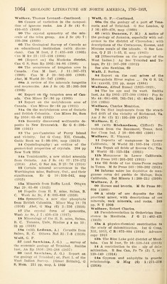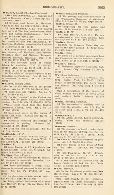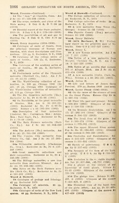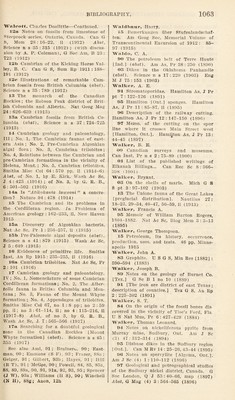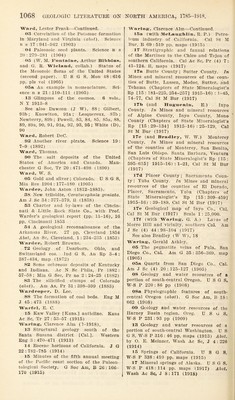 ![Ward, Lester Frank—Continued. 03 Correlation of the Potomac formation in Maryland and Virginia (abst). Science n s 17 :941-942 (1903) 04 Paleozoic seed plants. Science n s 20:279-281 (1904) 05 (W. M. Fontaine, Arthur Bilibins, and G. R. Wieland, collab.) Status of the Mesozoic floras of the United States (second paper). U S G S, Mon 48:616 pp, pis vol (1905) 05a An example in nomenclature. Sci¬ ence n s 21 :110-111 (1905) 13 Glimpses of the cosmos. 6 vols., N Y 1913-8 See also Dawson (J W), 88; Gilbert, 93b; Knowlton, 91a; Lesquereux, S7b; Newberry, 89b ; Powell, 83, 84, 85, S5a, 88, 89, 89a, 90, 91, 91a, 92, 93, 95; White (D), 90 Ward, Robert DeC. 93 Another river pirate. Science 19: 7-9 (1892) Ward, Thomas. 90 The salt deposits of the United States of America and Canada. Man¬ chester G Soc, Tr 20:471-498 (1890) Ward, W. S. 05 Gold and silver ; Colorado. U S G S, Min Res 1904:177-180 (1905) Warder, John Aston (1812-1883). 3S New trilobite, Ceratocephala goniata. Am J Sc 34:377-379, il (1838) 53 Charter and by-laws of the Cincin¬ nati & Little Rock Slate Co., with Prof. Warder’s geological report (pp. 11-16), 16 pp, Cincinnati 1853 54 A geological reconnaissance of the Arkansas River. 27 pp, Cleveland 1854 Abst, An Sc, Cleveland, 1:234-235 (1853) Warder, Robert Browne. 72 Geology of Deai’born, Ohio, and Switzerland cos. Ind G S, An Rp 3-4: 387-434, map (1872) S3 Some ochreous deposits of Kentucky and Indiana. Ac N Sc Phila, Pr 1882: 57-58; Min G Sec, Pr no 2:24-25 (1S82) S3 The silicified stumps of Colorado (abst). Am As, Pr 31:398-399 (1883) Wardroper, D. Lee. 88 The formation of coal beds. Eng M J 45 : 473 (1888) Warfel, E. C. 15 Kaw Valley [Kans.] anticline. Kans Ac Sc, Tr 27 : 53-57 (1915) Waring, Clarence Aim (7-1918). 13 Structural geology south of the Santa Susana district [Cal.]. Western Eng 3:470-471 (1913) 14 Eocene horizons of California. J G 22 :782-785 (1914) 15 Minutes of the fifth annual meeting of the Pacific coast section of the Paleon¬ tological Society. G Soc Am, B 26 : 166- 170 (1915) Waring, Clarence Aim—Continued. 15a (with McLaughlin, R. P.) Petro¬ leum industry of California. Cal St M Bur, B 69:519 pp, maps (1915) 17 Stratigraphic and faunal relations of the Martinez to the Chico and Tejon of southern California. Cal Ac Sc, Pr (4) 7 : 41-124, il, maps (1917) 17a Butte County ; Sutter County. In Mines and mineral resources of the coun¬ ties of Butte, Lassen, Modoc, Sutter, and Tehama (Chapters of State Mineralogist’s Rp [15 :181-225, 254-257] 1915-16) :1-45, 74-77, Cal St M Bur (1917) 17b (and Hugnenin, E.) Inyo County. In Mines and mineral resources of Alpine County, Inyo County, Mono County (Chapters of State Mineralogist’s Rp [15:29-134] 1915-16) : 25-129, Cal St M Bur (1917) 17c (and Bradley, W. W.) Monterey County. In Mines and mineral resources of the counties of Monterey, San Benito, San Luis Obispo, Santa Barbara, Ventura (Chapters of State Mineralogist’s Rp [15: 595-615] 1915-16) : 1-21, Cal St M Bur (1917) 17d Placer County; Sacramento Coun¬ ty ; Yuba County. In Mines and mineral resources of the counties of El Dorado, Placer, Sacramento, Yuba (Chapters of State Mineralogist’s Rp [15:309-459] 1915-16) : 39-189, Cal St M Bur (1917) 17e Geological map of Inyo Co., Cal. Cal St M Bur (1917) Scale 1:25,000. 17f (with Waring-, G. A.) Lavas of Morro Hill and vicinity, southern Cal. Am J Sc (4) 44 : 98-104 (1917) See also Bradley (W W), 18 Waring, Gerald Ashley. 05 The pegmatite veins of Pala, San Diego Co., Cal. Am G 35 : 356-369, map (1905) 05a Quartz from San Diego Co., Cal. Am J Sc (4) 20:125-127 (1905) 08 Geology and water resources of a portion of south-central Oregon. U S G S, W-S P 220:86 pp (1908) 08a Physiographic features of south- central Oregon (abst). G Soc Am, B 18: 662 (1908) 09 Geology and water resources of the Harney Basin region, Oreg. U S G S, W-S P 231 : 93 pp (1909) 13 Geology and water resources of a portion of south-central Washington. U S G S, W-S P 316: 46 pp, maps (1913) Abst, by O. E. Meinzer, Wash Ac Sc, J 4 : 226 (1914) 15 Springs of California. U S G S, W-S P 338:410 pp, maps (1915) 17 Mineral springs of Alaska. U S G S, W-S P 418: 114 pp, maps (1917) Abst, Wash Ac Sc, J 8; 171 (1918)](https://iiif.wellcomecollection.org/image/b29979869_0001_1074.jp2/full/800%2C/0/default.jpg)