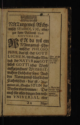 Naturgemes-alchymisch symbolum, oder, gahr kurtze Bekentnus ... von allgemeinem, natürlichen, dreyeinigen, wunderbaren, und wunderthätigen, allergeheimbsten Chao der naturgemessen Alchymisten: desz philosophischen universal und grossen Steins rechten natürlichen unnd eigenen Subjecto, oder, waren und einiger Materia / [Heinrich Khunrath].