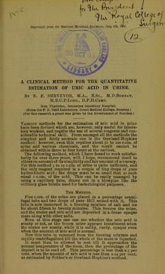 A clinical method for the quantitative estimation of uric acid in urine / by N.F. Surveyor.