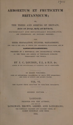 Arboretum et fruticetum Britannicum; or, the trees and shrubs of Britain, native and foreign, hardy and half-hardy, pictorially and botanically delineated, and scientifically and popularly described; with their propagation, culture, management, and uses in the arts, in useful and ornamental plantations, and in landscape gardening; preceded by a historical and geographical outline of the trees and shrubs of temperate climates. Throughout the world / By J.C. Loudon.