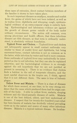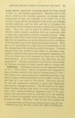 ![lymph glands, apparently remaining latent for long periods of time, i.e., not causing suppuration. Bacteria such as the above, which are the constant parasites, or perhaps rather commensals of man, are naturally to be looked for in the vicinity of man and on the surfaces of the body, on clothing, utensils, furniture; and the dust and dirt of all places fre- quented by human beings are found to contain more or less of them. They may also be found in polluted waters. But whether under natural conditions they are commonly able to maintain a saprophytic existence is another matter. Judg- ing from what I have read in the text-books I should suppose that the pus organisms are not so limited as to the conditions of their growth as are most disease-producing bacteria. They are not so dependent on a high and even temperature or on the composition of the medium on which they grow. I should suppose that they would be more likely to maintain a sap- rophytic existence than most other pathogenic organisms, yet I do not know that such existence for them has ever been demonstrated. In fact Gotschlich1 says that they are not saprophytes. Bacillus pyocyaneus has, however, been found, by Gorham, growing in a heap of moist rags at a paper mill. Diphtheria.— Diphtheria was not so very long ago believed to be a filth disease, that is, its germs were supposed to have a habitat outside of the body in various forms of dirt. This theory was common during my medical-school days, and when I began health-department work in 1884, I tried to fit the facts as I saw them to this theory. But they did not fit, and the impression continued to grow that diphtheria was a purely contagious disease. The life habits of the diph- theria bacillus indicate that while it is more resistant than some other disease-producing organisms next to be men- tioned, and somewhat easier to cultivate, it is very unlikely that it is able to propagate itself outside of the body, except at times in milk. Houston,2 while he does not consider his 1 Gotschlich, Kolle and Wassermann, Handbuch [etc.], Jena, IV, 173. 2 Houston, Loc. Gov. Bd. Rep. of Med. Off., 1898-9, XXVIII,' 413.](https://iiif.wellcomecollection.org/image/b2135151x_0043.jp2/full/800%2C/0/default.jpg)