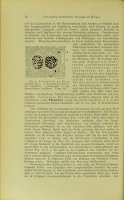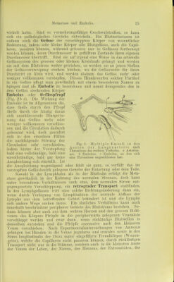 ![t t f ! i I i 7 I f : I wickelt hatte. Sind es vennehrungsfähige Geschwulstzellen, so kann sich ein pathologisches Gewächs entwickeln. Bei Blutnietastasen ist sodann auch die Grösse der verschleppten Körper von wesentlicher Bedeutung, indem sehr kleine Körper alle Blutgefässe, auch die Capil- laren, passiren können, während grössere nur in Gefässen fortbewegt werden können, deren Durchmesser in gefülltem Zustande ihren eigenen Durchmesser übertrifft. Sind sie auf irgend eine Weise in das arterielle Gefässsystem des grossen oder kleinen Kreislaufs gelangt und werden sie mit dem Blutstrom weiter getrieben, so werden sie an jenen Stellen der Gefässverzweigung stecken bleiben, wo die Gefässweite für ihren Durchtritt zu klein wird, und werden alsdann das Gefäss mehr oder weniger vollkommen verstopfen. Dieses Hineinwerfen solcher Partikel in ein Gefäss pflegt man gewöhnlich mit einem besonderen Namen zu belegen und als Embolie zu bezeichnen und nennt demgemäss den in dem Gefäss steckenden Körper Embolus oder Gefiisspfropf (Fig. 2 h c). Die Wirkung der Embolie ist im Allgemeinen die, dass theils durch den Pfropf theils durch die häufig daran sich anschliessende Blutgerin- nung das Gefäss mehr oder weniger vollkommen verschlos- sen und die Circulation dadurch gehemmt wird, doch gestaltet sich in den einzelnen Fällen die nachfolgende Störung der Circulation sehr verschieden, indem hinter der Verstopfung bald eine vollständige, bald eine unvollständige, bald gar keine Ausgleichung sich einstellt. Ist die Ausgleichung ungenügend oder fehlt sie ganz, so verfällt das im verstopften Gefässbezirk gelegene Gewebe der Entartung oder dem Tode. Sowohl in der Lymphbahn als in der Blutbahn erfolgt die Meta- stase gewöhnlich in der Richtung des normalen Stromes, doch kann unter besonderen Verhältnissen auch eine, dem normalen Strom ent- gegengesetzte Verschleppung, ein retrogTader Transport stattfinden. In den Lymphgefässen tritt eine solche Richtungsänderung dann ein, wenn durch Verlegung von Lymphbahnen der normale Abfluss der Lymphe aus dem betreffenden Gebiet behindert ist und die Lymphe sich andere Wege suchen muss. Ein ähnliches \erhältniss kann auch innerhalb beschränkter peripherer Gebiete des Blutstronis bestehen. So- dann können aber auch aus dem rechten Herzen und den grossen Hohl- venen des Körpers Pfröpfe in die peripherwärts gelegenen Venenäste verschleppt werden und zwar dann, wenn rückläufige Blutwellen in denselben entstehen und die Pfrö])fe successive nach den kleineren Venen vorschieben. Nach Experimentaluntersuchungen von Arnold gelangen bei Hunden in die Venae jugulares und crurales sowie in den Sinus longitudinalis der Dura mater eingeführte Fremdkör])er (Weizen- gries), welche die Capillaren nicht passiren können, durch rückläufigen Transport nicht nur in die Stämme, sondern auch in die kleinsten Aeste der Venen der Leber, der Nieren, des Herzens, der Extremitäten, dei Fig. 2. Multiple Emboli in den Aesten der Lungenarterie nach Thrombose des rechten Vorhofes, a Arterien- ast. b Embolus, e Embolus, an den sich eine Thrombose angeschlossen hat. i](https://iiif.wellcomecollection.org/image/b28124388_0001_0091.jp2/full/800%2C/0/default.jpg)