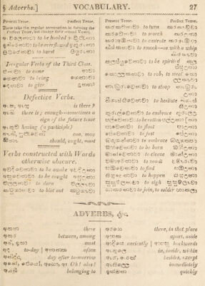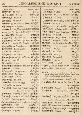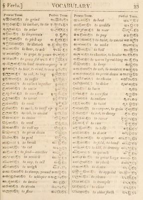 ![» c?pt<^!c^6o <^g©o ^£>£%eo £ft0 tte©0 C^t6Q 0o § Fer/;s.] Present Tense. Perfect Tense. CftDd^fDo to grind <pL@‘dl0o «yeq<5«o03 to inclose. to //e <¥cW<5V0o - -* cJ. cp(T**3O0O to sme «p 0^00 to imprecate q>00€5O0o to pick up <02eX33SQ0O to disturb ^C&«D0o tofezr, toasjfc *$>O*jS«5O0o to gape, to pawn e0<5«*o©o to grow fat -qpv^i 00 [©£,00 cpL<5 0«D0o to /cGf/. to accompany £?<■ O' f'tf«5O0O 0 /e<?r5 to rewof, to saw §C) c©o f’(33>57)0O to tvs#,' to />eg* fvjttOo f>8£3^500 3 to suffer <g>0 to 0 o 0^^5000 to collect together f»?^)0o 0^0^000 0 untie «©0©o <^,^0 ^00 to overflow f ^O©0o £\g<5<eQ©0 to wrest ^gc?r0'o (aa3«D0O to cook 4 0 00 ^d’^5000 to suck, to snuff up <§>o l.00 ^.(3^5000 to rub, to anoint f 0L’0O 0-50 ao0o to twine f5 0 ©o’ C9 0*5000 0 sewfi? ci)aD*2D0o to roll up §)£D«n0O to press down ©g3*5<-0o to peel *s>©«50£ 0 to break >»<b«5D©3 to c&/ 00 to feed—-another 250'Jf *5000 to scratch *»<jo«5O0o to £«y, 0 /e/7 *r>kf*5O0O to weigh ©«5DO0e?D.0O to stamp, pound ®25oO©o r© © es>0go «50©0 to whisper <s>co,go l©o *35t.$j«5O0o to invite icsoig0; dotf*5o8o to strain $Oi/Ot©o «>GW©0, to/ori? <&L0t0o 0000. 00.0o ' 0©0o 0.0 00 cJ <55t 000 C--3 <07 O CJ 00 eJ *»l08o CJ t- “J « *57 0 ©0 *>«K3to©0 Perfect Tense. C50L 0 0 3 Cfc\ O 0o rs c-1 i 00 Present Tense, c5Oo^e?o0o to beat c$do0*5O0o to waddle G5Oc?tcr«JO0o to rer/r ©Cfc©*5O0o to pay ® -P-0) 0O © 5~oao»o0o to to/5/, to weave ®c£ oo0O ao mon*jo0o to make aoi,*5O0o ^®)?5O0) to &o/7 a>d!)0O C© «&(3**o0O to chastise, to bruise &u<000o ^0^000 0 warm by rubbing ao 0 ©o ^ £5 j ao©<30©o to keep «o©0o J cJ ©ao 2)^5000 to tee/, to moisten ®cjd@0o cJ ®wocTC3«5D09 to press down ®aocro©0 ciJ ©aojcfoo^o to choose # *tJ©c0 o gs©2d3*50£© to drive *5o0o g*50©0 to bum ^00 a or ^ <*0 0o /o sacrifice © of 00 ... J «j g o 00 /o endure © cf l 0q C0a^o©o to twist ©0 000 0 ^50^0)00 to conquer, to gain g«5O0o g c5^J000' /o ro/, to cfectfy 0© l 0o' ^ ^^00 to swear g Q 51 ©o g0«, £ o: /o run a 0©o ^ 0 J ©-250©o /O talk cJ ©00 v <•-J ^7-c00O eot eoo0o /o dance ^00^0^00 to appease ^>'0l 0 - o-; 0o . «^:0<!5O0o to fold, to bend ^>0^0 00 «9O&o«tj0o to kill, to destroy ■^Qcfn0o 0 /o quenc'h ©J0 0^ ‘ e ! ©o to grej£> /</rge ®^oo.0o ®a>~)(3eoo©o to pluck ®^O(^ 0o to -?r»o©o /c? desire ci) \8^.0)j to c_l CJ C0^. 0)3 to cleave . t3O^ an0 O to trample ttxj?*. ©o 00 • C’OP)C(o to clear t7\i00o cJ 00 L 7^00 zi dw — appoint Wt©—©^ ^xt^0o C0o3^©o to shine forth J](https://iiif.wellcomecollection.org/image/b29295464_0033.jp2/full/800%2C/0/default.jpg)