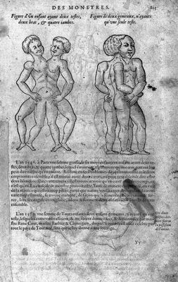 Credit: M0018184: Two illustrations of conjoined twins, 1575. Source: Wellcome Collection.