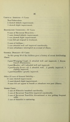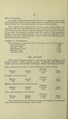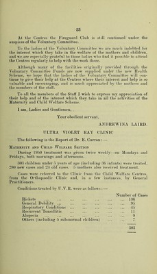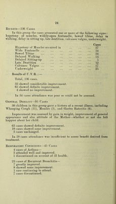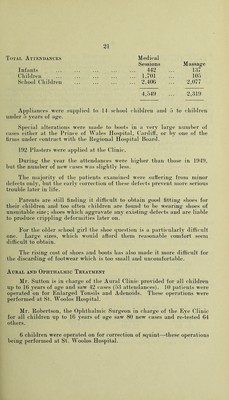 ![Total Attendances Medical Sessions Massage Infants 442 137 Children 1,701 105 School Children 2,406 2,077 4,549 2,319 Applium-es were supplied to 14 seliool cliildreu aud -3 to eliildreu uuder 5 _years of age. Special alterations were made to boots in a very large numl)er of cases either at the Prince of Wales Hospital, (Jardiif, or by one of the firms under contract with the itegional Hos])ital Board. 192 Plasters were applied at the Clinic. During' the year the attendances were higher than those in 1949, hut the number of new cases was slightly less. The majority of the ])atients examined were suffering from minor defects only, but the early correction of these detects prevent more serious trouble later in life. Parents are still finding it difficult to obtain good fitting shoes for their children and too often children are found to be wearing shoes of unsuitable size; shoes which aggravate anj^ existing defects aud are liable to produce crippling deformities later on. For the older school girl the shoe question is a particularly difficult one. Large sizes, which would afford them reasonable comfort seem difficult to obtain. The rising cost of shoes and boots has also made it more difficult for the discarding of footwear which is too small aud uncomfortable. Aural and Ophthalmic Treatment Mr. Sutton is in charge of tlie Aural Clinic provided for all children up to 16 years of age and saw 42 cases (53 attendances). lU patients were operated on for Enlarged Tonsils and Adenoids. These operations were performed at St. Woolos Hospital. Mr. Robertson, the Ophthalmic Surgeon in charge of the Eye Clinic for all children up to 16 years of age saw 80 new cases and re-tested 64 others. 6 children were operated on for correction of squint—these operations being performed at St. Woolos Hospital.](https://iiif.wellcomecollection.org/image/b28866915_0027.jp2/full/800%2C/0/default.jpg)
