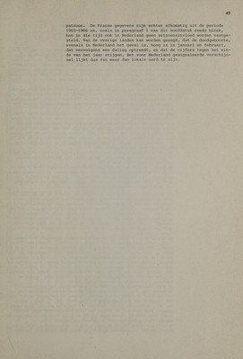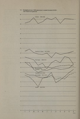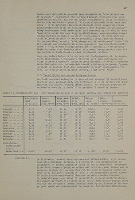![land 1971/1973 niee sn MN a LOGO BPEDrUaLr1. eren « 9,42 MATE ne aes 8,98 i Not ae be te eee re NER a eles: © 9,09 LANs Nee Kees OFS DE a oe Mes NG 8,94 BUGUSEUS nen a 9,26 September ..... 9,45 OIEDDELL te ers eee 9,40 November ...... Sirs: December ...... Ono d Lorrelatie- coéfficiént Es Vie Nederland r = +0,67 grafiek 13 47 Vooral de lijn, die de maandelijkse doodgeboorte afwijkingen van de placenta (codenummer 770) in beeld brengt, vertoont veel over- eenstemming met de lijn van de totale doodgeboorte (alle oorzaken), die in grafiek 10 is afgebeeld. Als correlatiecoéfficiént werd dan ook r = +0,90 gevonden. De correlatiecoéfficiént tussen de totale doodgeboorte enerzijds en doodgeboorte door toxemie van de zwanger- schap (codenummer 762) anderzijds werd berekend op r = +0,735. Voor moeilijke bevalling door liggingsafwijkingen, wanverhouding tussen bekken en kind en andere oorzaken (codenummers 764-769) werd een correlatiecoéfficiént r = +0,70 gevonden, terwijl met betrekking tot de gevallen, waarbij afwijkingen van de navelstreng (code 771) als oorzaak van doodgeboorte waren opgegeven, een correlatiecoéffi- ciént r = +0,54 werd geregistreerd. De in grafiek 12 vertegenwoor- digde (groepen van) doodsoorzaken zijn samen aansprakelijk voor 61% van de totale doodgeboorte in het beschouwde tijdvak. Voor een andere belangrijke oorzaak van doodgeboorte, nl. de aange- boren afwijkingen (codenummers 740-759) werd geen correlatie van enige betekenis gevonden (correlatiecoëfficiënt r = +0,45). Ongeveer hetzelfde geldt voor de numeriek tamelijk belangrijke groep: prema- turiteit en foetale dood door onbekende oorzaak (codenummers 777, 779). De correlatiecoëfficiënt bedroeg in dit geval +0,48. 3.7. Vergelijking met andere Europese landen Het leek van enig belang na te gaan of een soortgelijk verschijnsel als hier werd gesignaleerd, ook zichtbaar is in de cijfers van dood- geboorte van andere, vergelijkbare landen. Het gelukte gegevens te verzamelen over de in staat 13 en grafiek 13 vermelde landen. Dene- Engeland marken en Wales 1971/1974 | 1971/1973] 1965/1966 11971/1976 Tisa 12,44 IES 2E) 10,10 Lele 7,46 7,45 12,83 18,91 10,00 10,9 7,07 7,43 2.16 19,44 8,67 10,6 6,21 7,04 Pigs ere, 8,03 PT) ay OF! 6,82 Tien 79 lies oe siete 9,9 6,83 7,04 12,06 19,33 8,34 8,8 6,94 8,09 Leelee! 18,98 8,74 10,0 7,45 5,53 12713 19,44 8,86 10,5 6,56 6,43 GONE 18,19 8,65 O0, 6,84 TAD 14,95 19,20 8,68 1 ed 6,69 8,03 E20 19,10 8,90 11,0 IER, 8,64 12,44 19,00 ORAZ el 1,83 0,49 +0,69 „0,15 i700 +0, 53 +0,63 De tijdvakken, waarop deze gegevens betrekking hebben, zijn helaas niet alle dezelfde. Terloops zij opgemerkt, dat doodgeboorte in Denemarken en Zweden duidelijk lager is dan in Nederland. Noorwegen lijkt iets hogere cijfers te hebben dan ons land, maar indien men in rekening brengt, dat de gegevens van dat land betrekking hebben op 1969-1972, dan wordt duidelijk, dat in laatstgenoemd tijdvak tussen de beide landen geen verschillen van betekenis hebben bestaan. De onderste regel van staat 13 vermeldt de correlatiecoëfficiënten, die werden gevonden bij vergelijking van de Nederlandse maandcijfers met die van de andere landen. Hierbij valt op dat Frankrijk als eni- ge geen spoor van overeenkomst vertoont met het duidige Nederlandse](https://iiif.wellcomecollection.org/image/b32221411_0049.jp2/full/800%2C/0/default.jpg)