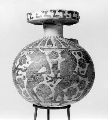 Credit: M0018099: Round aryballos, late Corinthian, showing 6 padded dancers and a siren. Source: Wellcome Collection.