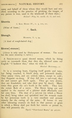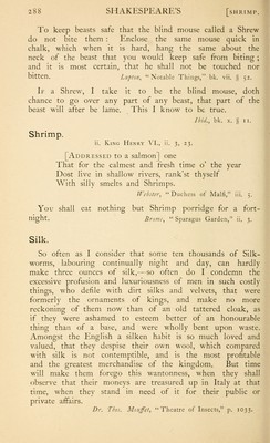 ![To keep beasts safe that the blind mouse called a Shrew do not bite them : Enclose the same mouse quick in chalk, which when it is hard, hang the same about the neck of the beast that you would keep safe from biting ; and it is most certain, that he shall not be touched nor bitten. Luptoti, Notable Things, bk. vii. § 52. If a Shrew, I take it to be the blind mouse, doth chance to go over any part of any beast, that part of the beast will after be lame. This I know to be true. Ibid., bk. X. § II. Shrimp. ii. King Henry AT., ii. 3, 23. [Addressed to a salmon] one That for the calmest and fresh time o' the year Dost live in shallow rivers, rank'st thyself With silly smelts and Shrimps. Webster, Duchess of Malfi, iii. 5. You shall eat nothing but Shrimp porridge for a fort- night. Brome, Sparagus Garden, ii, 3. Silk. So often as I consider that some ten thousands of Silk- worms, labouring continually night and day, can hardly make three ounces of silk,—so often do I condemn the excessive profusion and luxuriousness of men in such costly things, who defile with dirt silks and velvets, that were formerly the ornaments of kings, and make no more reckoning of them now than of an old tattered cloak, as if they were ashamed to esteem better of an honourable thing than of a base, and were wholly bent upon waste. Amongst the English a silken habit is so much loved and valued, that they despise their own wool, which compared with silk is not contemptible, and is the most profitable and the greatest merchandise of the kingdom. But time will make them forego this wantonness, when they shall observe that their moneys are treasured up in Italy at that time, when they stand in need of it for their public or private affairs. Dr. Thos. Mouffet, Theatre of Insects, p. 1033. I I](https://iiif.wellcomecollection.org/image/b2100433x_0300.jp2/full/800%2C/0/default.jpg)
