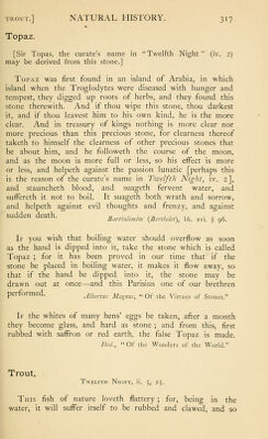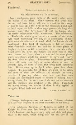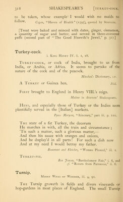 ![to be taken, whose example I would wish no maids to tollOW. Cogan, Haven of Health (i 595), quoted by Stcevcns. [Trout were baked and minced with dates, ginger, cinnamon, a quantity of sugar and butter, and served in three-cornered puffs (second part of The Good Huswife's Jewel, p. 31).] Turkey-cock. i. King Henry IV. ii. l, 28. Turkey-cock, or cock of India, brought to us from India, or Arabia, or Africa. It seems to partake of the nature of the cock and of the peacock. Min shell's Dictionary, s.z'. A Turkey or Guinea hen. ihid. First brought to England in Henry VIII.'s reign. Malone in Steez'ens' Shakespeare. Hens, and especially those of Turkey or the Indies seem plentifully served in the [Italian] markets. Fynes Moryson, Itinerary, part iii. p. iio. The state of a fat Turkey, the decorum He marches in with, all the train and circumstance ; 'Tis such a matter, such a glorious matter,— And then his sauce with oranges and onions. And he display'd in all parts ! For such a dish now And at my need I would betray my father. Beaumont and Fletcher^ Woman Pleased,' iii. i. Turkey-pie. Ben JcJison, Bartholomew Fair, i. 6, and (■/. Return from Parnassus, ii. 6. Turnip. Merry Wives of Windsor, iii. ..j., 90. The Turnip groweth in fields and divers vineyards or hop-gardens in most places of England. The small Turnip](https://iiif.wellcomecollection.org/image/b2100433x_0330.jp2/full/800%2C/0/default.jpg)