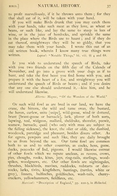 ![to profit marvellously, if it be thrown unto them ; for they that shall eat of it, will be taken with your hand. If you will make Birds drunk that you may catch them with your hands, take such meat as they love, as wheat or beans, or such like, and lay the same to steep in lees of wine, or in the juice of hemlocks, and sprinkle the same in the place where the Birds use to haunt ; and if they do eat thereof, straightways they will be so giddy, that you may take them with your hands. I wrote this out of an old written book, wherein I know many true things were written. Luptotfs Notable Things, bk. viii. §§ + and 68. If you wish to understand the speech of Birds, take with you two friends on the fifth day of the Calends of November, and go into a grove with your dogs as if to hunt, and take the first beast you find home with you, and prepare it with the heart of a fox, and straightway you will understand the speech of Birds or beasts ; and if you desire that any one else should understand it,—-kiss him, and he will understand likewise, Albertus Magnus, Of the Wonders oF the World. Of such wild fowl as are bred in our land, we have the crane, the bittern, the wild and tame swan, the bustard, the heron, curlew, snite [snipe], wild-goose, wind or dotterel, brant [brant-goose or barnacle], lark, plover of both sorts, lapwing, teal, widgeon, mallard, sheldrake, shoveler, peewit, seamew, barnacle, quail (who only with man are subject to the falling sickness), the knot, the oliet or olife, the dunbird, woodcock, partridge and pheasant, besides divers other. As for egrets, pawpers and such like, they are daily brought to us from beyond the sea. Our tame fowl are common both to us and to other countries, as cocks, hens, geese, ducks, peacocks of Ind, pigeons. I would likewise entreat of other fowls which we repute unclean, as ravens, crows, pies, choughs, rooks, kites, jays, ring-tails, starlings, wood- spikes, woodgnaws, etc. Our other fowls are nightingales, thrushes, blackbirds, mavises, ruddocks, redstarts or dun- nocks, larks, tivits, kingfishers, buntings, (turtles, white or grey), linnets, bulfinches, goldfinches, wash-tails, cherry- crackers, yellowhammers, fieldfares, etc. Harrho7i^s Description of England, pp. 222-3, in Holinsbed.](https://iiif.wellcomecollection.org/image/b2100433x_0049.jp2/full/800%2C/0/default.jpg)