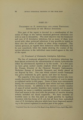 Human intestinal protozoa in the Near East : an inquiry into some problems affecting the spread and incidence of intestinal protozoal infections of British troops and natives in the Near East, with special reference to the carrier question, diagnosis and treatment of amoebic dysentery, and an account of three new human intestinal protozoa / by C.M. Wenyon and F.W. O'Connor.