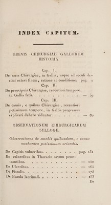![INDEX CAPITUM. BREVIS CHIRURGIAL HISTORIA GALLORUM Cap. l. De varia Chirurgiae, in Gallia, usque ad seculi dc- cimi octavi finem, ratione ac condiuone. Cap. ll. De praecipuis Chirurgiae, recentiori tempore, in Gallia fatis. pag.. Cap, IH. De causis, e quibus Chirurgiae , recentüori potissimum tempore, in Gallia progressus explicari debere videntur. Sims ST D r . * LI ^ ea óa OBSERVATIONUM CHIRURGICARUM SYLLOGE. Obsereationes de morbis quibusdam, e causa mecanica potissimum, ortundis, De Capius vudEeribüs. a5. v x c.pag. 194 De vulneribus in Thoracis cavum penc- trantibus. e L] * * dv Sa tot dicem an EEUU. OueteoR ines o, s oom x08 ESBELOHLLL 4s Xo xe. I ema](https://iiif.wellcomecollection.org/image/b33092710_0021.jp2/full/800%2C/0/default.jpg)