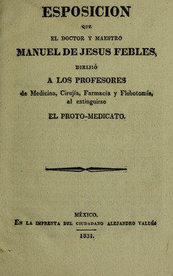 Esposicion que el doctor y maestro Manuel de Jesus Febles dirijió a los professores de medicina, cirujía, farmacia y flebotomía, al extinguirse el Proto-medicato.