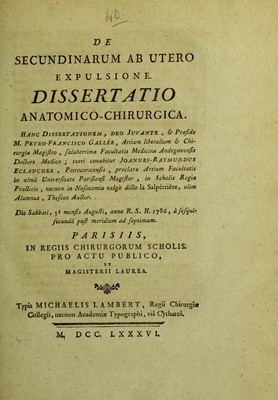 De secundinarum ab utero expulsione : dissertatio anatomico-chirurgica : hanc dissertationem, Deo juvante, & praeside M. Petro-Francisco Gallée ... / tueri conabitur Joannes-Raymundus Eclancher, theseos auctor.