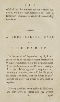 ![PRACTICAL OBSERVATIONS UPON THORN WOUNDS, PUNCTURED TENDONS, AND LIGAMENTARY LAMENESS, I N ’ 33 O R s E S, WITH EXPERIMENTAL INSTRUCTIONS \ ' FOR THEIR TREATMENT AND CURE. ILLUSTRATED BY A RECITAL OF CASES, INTERSPERSED WITH A VARIETY OF USEFUL REMARKSa TO WHICH IS ADDED A SUCCESSFUL METHOD Op TREATING THE CANINE SPECIES, IN THAT DESTRUCTIVE DISEASE CALLED / THE DISTEMPER: THE WHO! E FORMING A SUPPLEMENT TO The Gentleman’s Stable Dire&ory, By W1L L IA Mf. T A P L IN, Surgeon. LONDON: 5*SINTID FOR G, KEAR4LEY, AT JOHNSON^ HE AD, FLElT'STf.IIT, M DCC XC. [ PRICE ONE SHILLING.] filterat Stationers ^att.](https://iiif.wellcomecollection.org/image/b30347063_0001.jp2/full/800%2C/0/default.jpg)