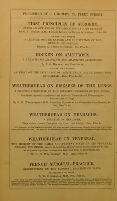 A practical treatise on the principal diseases of the lungs, : considered especially in relation to the particular tissues affected, illustrating the different kinds of cough. / By G. Hume Weatherhead, M.D.