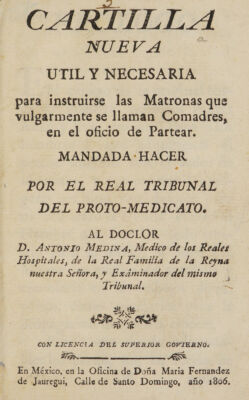 Cartilla nueva util y necesaria para instruirse las matronas que vulgarmente se llaman comadres, en el oficio de partear / Mandada hacer por el Real Tribunal del Proto-Medicato. Al Doclor [sic] D. Antonio Medina.