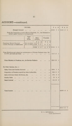 ![4] ACCOUNT—continued. INCOME. Brought forward ... ee ies eas; 480s nae From the Treasurers of other Mental Hospitals, &c., for Patients re- ceived under Contract or arrangement. Rate per Main- Funerals. Week. tenance. £8. -d; Napsbury Mental Hospital ..-| 30/1 & 29/94} 1173 13 3 County Borough of Eastbourne | 30/1 & 29/9$|12009 9 11 11 13183 3 2 11 From Relatives and others for maintenance of Private Patients from 28/- to 105/- per head per week ... 596 eae one one one ane From Ministry of Pensions, etc., for Service Patients nce eee “08 By Other Income, viz. :— Sales, Farm and Garden Account ... sas Sea “as Bie eae Proportion of Pensions repaid by other Authorities es wee a8 Sale of Kitchen Stuff, Old Stores, etc. Sundry Sales... eve ro, wes een aes oe ane “es Bank Interest ... ees oe ese wen re errs ave oes LILO hr ie earn eae Seeded gs At RA ae AP 66560 14 3 W. E. MITCHELL,](https://iiif.wellcomecollection.org/image/b31857103_0043.jp2/full/800%2C/0/default.jpg)