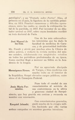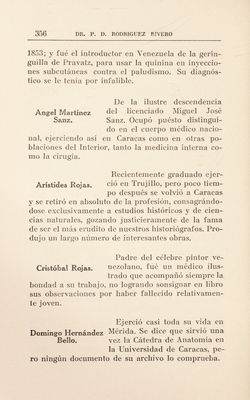 ![« Fue el sucesor del doctor de Alejandro Frías Briceño en la Cátedra de Ana- jiicrs tomía de la Universidad; sus diez años consecutivos de enseñanza de esta Cien¬ cia, le lian hecho inolvidable en las Aulas. Ocupó puésto distinguido entre los cirujanos de su época. Se distingiuó en la cirugía Francisco j. .llar- desde muy joven, operando en los hospitales, y en el ejército, pero la muerte le acechó prematuramente, privando a la Ciencia de su actividad y virtudes. Rafael Vil] cencío. vi- Filósoío y erudito médico, se dió alguna vez a la práctica de la homeopatía; sirvió la Cátedra libre de Antropología y de Historia de la Medicina en la Universidad Central, de cuyo Insti¬ tuto fué Rector. Perteneció por lo extenso de sus co¬ nocimientos a todas las Corporaciones Académicas venezolanas. Muy poco conocido aqui, le Ricardo Espinal. le hizo honor a la Patria en el Exterior. Nació en Caracas en 1826, e hizo sus estudios con el Dr. Vargas y Eliseo Acosta hasta que se gra¬ duó en 1853. Al graduarse se trasladó á París donde quiso dedicarse a la odontología, pero a poco cambió por la oftalmología que estudió cinco años consecutivos practicando con Desmarres, de quien llegó a ser Je¬ fe de Clínica. En 1861 hizo contrato como médico de la Colo¬ nia española de Palambo (Perú); al cabo de algún](https://iiif.wellcomecollection.org/image/b29825143_0372.jp2/full/800%2C/0/default.jpg)