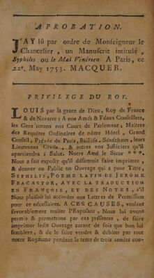 Syphilis ou le mal vénérien / poème latin de J érôme Fracastor, avec la traduction en françois, et des notes [by P. Macquer and J. Lacombe] [With life of Fracastorius].
