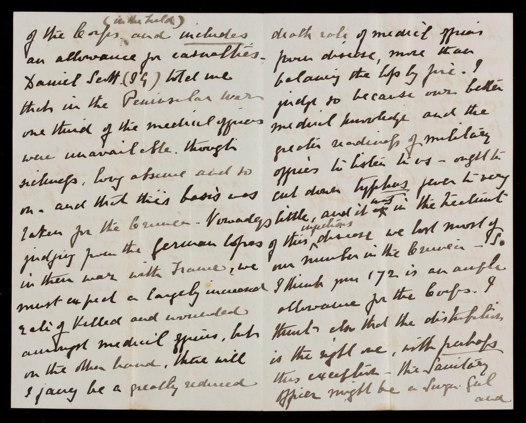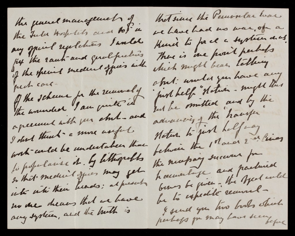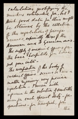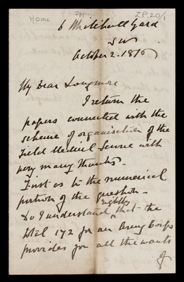 Credit: Various Reports:- Colonel Horne's suggestions on distributions of medical department in the field (with 2 letters from Horne); Colonel Brackenbury's questions (with letter from Brackenbury); organisation of line of communications with army on the field; list of medicines for medicine wagon; bearer companies in British service. Source: Wellcome Collection.