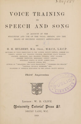 Voice training in speech and song : an account of the structure and use of the vocal organs and the means of securing distinct articulation / by H.H. Hulbert.