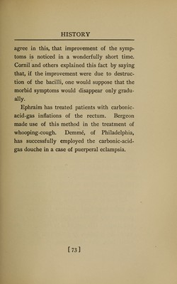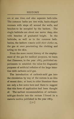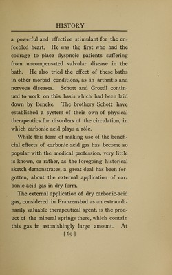 ![a powerful and effective stimulant for the en- feebled heart. He was the first who had the courage to place dyspnoic patients suffering from uncompensated valvular disease in the bath. He also tried the effect of these baths in other morbid conditions, as in arthritis and nervous diseases. Schott and Groedl contin- ued to work on this basis which had been laid down by Beneke. The brothers Schott have established a system of their own of physical therapeutics for disorders of the circulation, in which carbonic acid plays a role. While this form of making use of the benefi- cial effects of carbonic-acid gas has become so popular with the medical profession, very little is known, or rather, as the foregoing historical sketch demonstrates, a great deal has been for- gotten, about the external application of car- bonic-acid gas in dry form. The external application of dry carbonic-acid gas, considered in Franzensbad as an extraordi- narily valuable therapeutical agent, is the prod- uct of the mineral springs there, which contain this gas in astonishingly large amount. At [69]](https://iiif.wellcomecollection.org/image/b21169020_0091.jp2/full/800%2C/0/default.jpg)