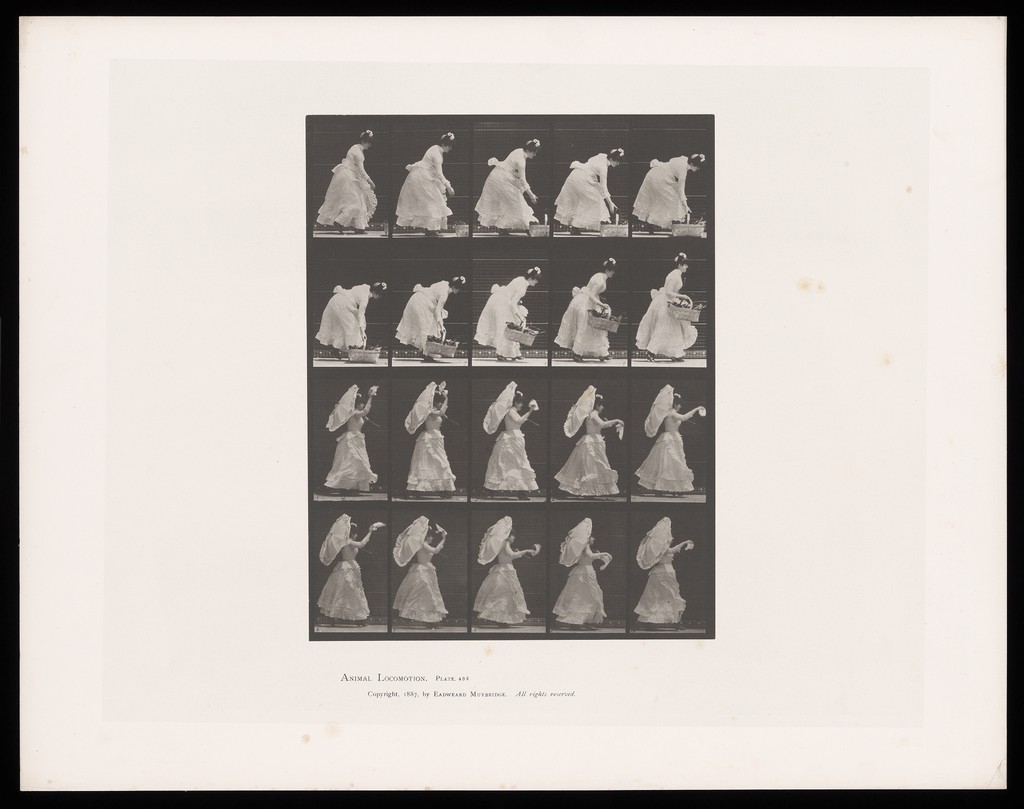 Credit: A clothed woman picks up a basket then carries a parasol and waves a handkerchief. Collotype after Eadweard Muybridge, 1887. Source: Wellcome Collection.