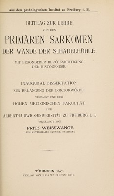 Beitrag zur Lehre von den primären Sarkomen der Wände des Schädelhöhle : mit besonderer Berücksichtigung der Histogenese ... / vorgelegt von Fritz Weisswange.