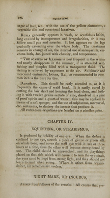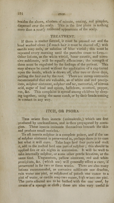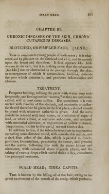 ![CHAPTER III. CHRONIC DISEASES OF THE SKIN, CHRONIC CUTANEOUS DISEASES. BLOTCHED, OR PIMPLED FACE. [ACNE.] This is common to young people of both sexes ; it is char- acterised by pimples on the forehead and chin, and frequently upon the breast and shoulders. It first appears like little worms in the skin, but it is nothing more than the sebaceous [fat like] matter obstructed in its passage ihrough the skin? in consequence of which it accumulates, hardens, distends the pore which contains it, and produces inflammation and abscess. TREATMENT. Frequent bathing, rubbing the parts with warm soap sxids frequently, a»d forcing out the worms, as they are commonlv called, will in most cases suffice. But sometimes it is con- nected with disorder of the stomach, and an emetic or cathar- tic should therefore be given in the first place, calomel should be jo:ned with whatever cathartic is given. And the sores should be washed with lead water, or a solution of sugar of lead, or white vitriol, or corrosive sublimate, and anointed with mercurial ointment, or unguentum or yellow ointment, (unguentum, nitritis hvdrarggri,) several times a day. In addition to this, if the tubercles terminate in suppuration spreading some distance round, with considerable matter, and a dark blue color of the skin, which is painful to touch; poultices, fomentations, puncturing the tumor, and pressing- out the matter, following this with the above lotions and ointments, with occasional doses of gentle physic, and the taking of twenty drops elixir vitriol thrice a day, constitutes the principal treatment. SCALD HEAD; TINEA CAPITIS. This is known by the falling off of the hair, owing to too great excitement of the vessels of the scalp, which produces,](https://iiif.wellcomecollection.org/image/b21163856_0127.jp2/full/800%2C/0/default.jpg)