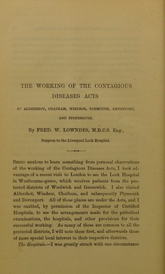 Prostitution and syphilis in Liverpool and the working of the Contagious Diseases Acts, at Aldershot, Chatham, Plymouth, and Devonport / by Frederick W. Lowndes.