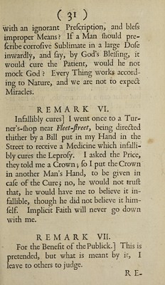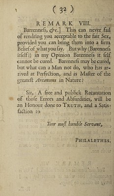 ![\ / * * * • • . r + .f * REMARK VIII. . .... ** f'' ^ f ■ i J * * J if | ^ N £ ‘ •’ J ^ 4 *• , v ‘ Barrennels, e^'c.] This can never fail of rendring you acceptable to the fair Sex, provided you can bring them into a firm Belief of what you lay. But why (Barennels itfelf?) in my Opinion Barennefs it lelf cannot be cured. Barennels may be cured, but what can a Man not do, who has ar¬ rived at Perfection, and is Mailer of the greateft Arcanums in Nature ? Sir, A tree and publick Recantation of thole Errors and Ablurdities, will be an Honour done to Truth, and a Satis¬ faction to Tour mofl humble Servant, Philalethes.](https://iiif.wellcomecollection.org/image/b31973590_0032.jp2/full/800%2C/0/default.jpg)